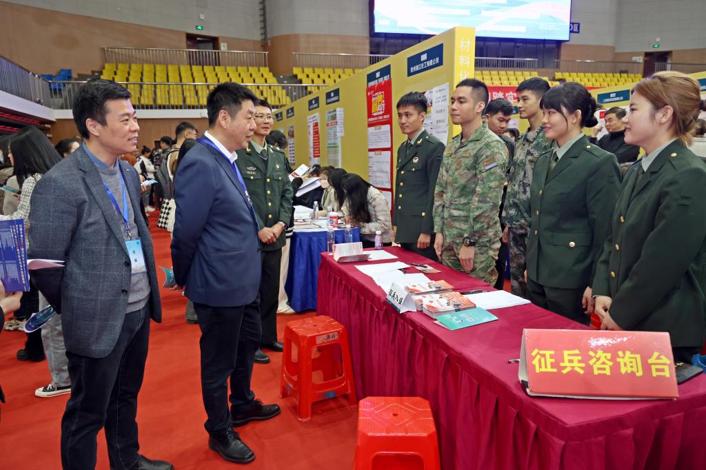 本次征兵宣講會(huì )承襲往年做法,在校畢業(yè)生大型招聘會(huì )上設置展位,抓住畢業(yè)生人數眾多的契機,拓展宣傳渠道,更高效便捷地開(kāi)展政策宣講?;顒?dòng)現場(chǎng)氣氛熱烈,征兵宣傳人員通過(guò)懸掛橫幅、設置咨詢(xún)臺、擺放展板、發(fā)放征兵宣傳資料、現場(chǎng)咨詢(xún)、現場(chǎng)加群等方式,向有入伍意向同學(xué)細致講解今年的征兵政策條件、報名方法及相關(guān)優(yōu)待政策,深入宣傳依法服兵役的積極意義,鼓勵即將畢業(yè)的同學(xué)積極報名應征,報效祖國。期間也吸引了部分研究生現場(chǎng)咨詢(xún)了解。