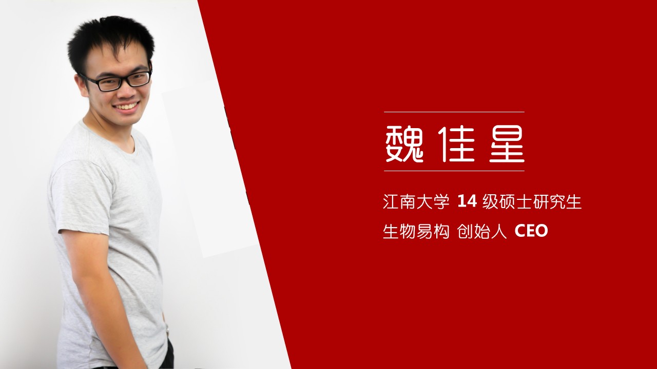 魏佳星,男,漢,中共黨員,oety歐億機械工程學(xué)院包裝工程2014級碩士研究生。2015年他與創(chuàng )辦南京生構垠創(chuàng )信息科技有限公司并完成A輪1000萬(wàn)融資,估值5000萬(wàn),IBM SmartCamp會(huì )員單位,旗下產(chǎn)品生物易構(中國儀網(wǎng))|科研資源共享平臺旨在構建未來(lái)的科研生態(tài)系統,為科研提供更多的信息化服務(wù)。為400家科研機構提供科研資源共享服務(wù),提供服務(wù)600萬(wàn)項,總計流量超過(guò)3200萬(wàn),與5所高校及6家政府單位戰略合作,月?tīng)I業(yè)額超150萬(wàn)、軟件著(zhù)作權3項。2016年作為創(chuàng )業(yè)代表接受阿里巴巴集團CEO張勇授予的“阿里巴巴全球夢(mèng)想家”稱(chēng)號。獲“創(chuàng )青春”全國大學(xué)生創(chuàng )業(yè)大賽金獎在內國家級創(chuàng )新創(chuàng )業(yè)競賽獎項17項,省級競賽榮譽(yù)近30項,市校級榮譽(yù)近30項,并接受光明日報、江蘇衛視、中國教育報等30多家媒體報道。