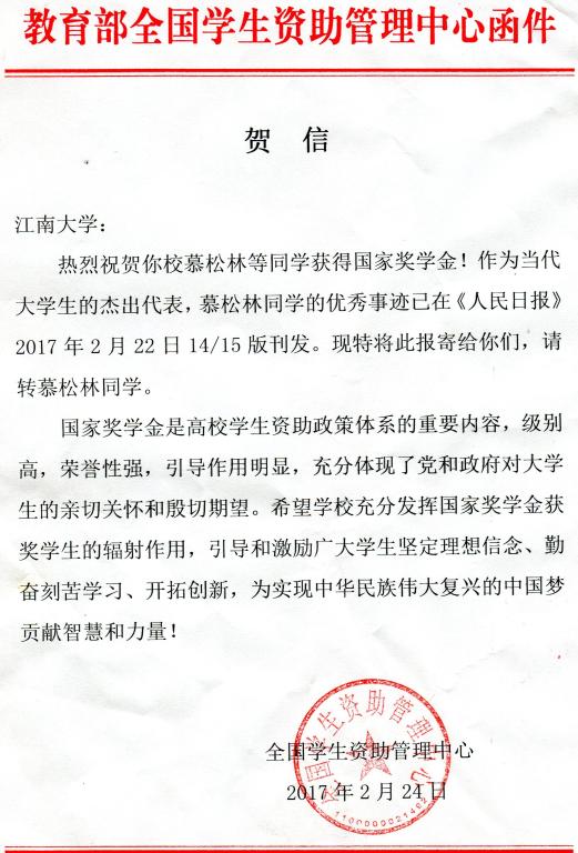 全國學(xué)生資助管理中心祝賀慕松林同學(xué)獲得國家獎學(xué)金賀信