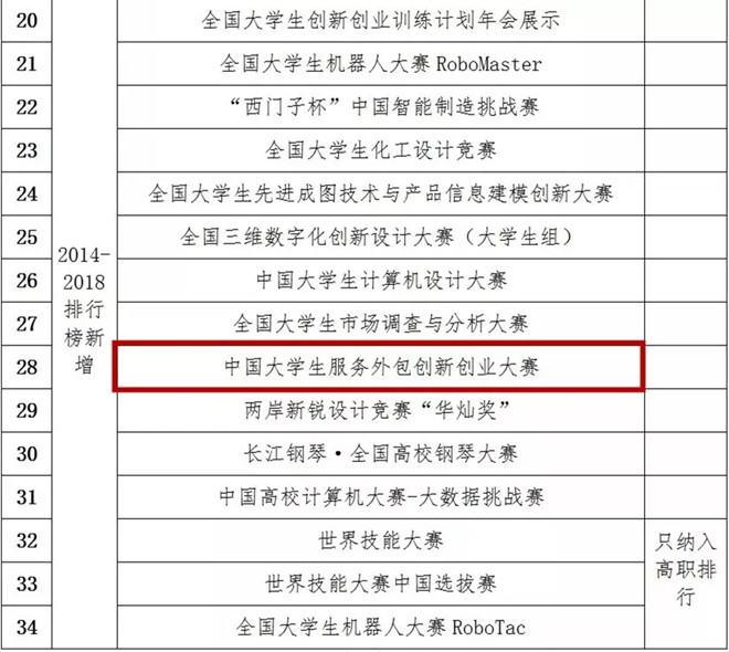 據悉,高等教育學(xué)會(huì )對2014-2018年我國普通高校學(xué)科競賽排行榜的競賽項目進(jìn)行了擴容,新增了15項競賽(本科類(lèi)競賽12項,高職類(lèi)競賽3項)。其中,由教育部、商務(wù)部和無(wú)錫市政府主辦,國家服務(wù)外包人力資源研究院、無(wú)錫市商務(wù)局、無(wú)錫市教育局和oety歐億共同承辦的中國大學(xué)生服務(wù)外包創(chuàng )新創(chuàng )業(yè)大賽從64個(gè)申請項目中脫穎而出,躋身排行榜單項目。