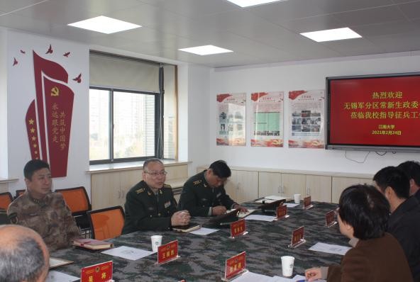 2月24號上午無(wú)錫軍分區政委常新生大校,蔡志龍處長(cháng)在濱湖區人民武裝部政委王頤然長(cháng)滕曉啟陪同下一行六人來(lái)oety歐億調研和指導大學(xué)生征兵工作,校黨委副書(shū)記戴月波、人武部部長(cháng)張菁燕以及其他人民武裝部工作人員參加了座談會(huì )。