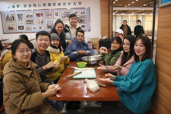 活動(dòng)伊始,汪雙喜部長(cháng)親切地給同學(xué)們介紹了傳統節日—冬至的來(lái)歷及其蘊含的豐富意義,傳達了學(xué)校對各族同學(xué)的關(guān)心關(guān)懷。他表示這次主題活動(dòng)既是一場(chǎng)弘揚中華文化的盛宴,也是一次各族學(xué)生歡聚一堂,共敘佳話(huà)的溫馨家宴,希望同學(xué)們感受到中華文化的博大,江南一家的溫暖,并鼓勵同學(xué)們將中華民族共同體意識根植于心,在相互交流、相互尊重、相互學(xué)習中共同成長(cháng),做中華文化的傳承者,做民族團結的傳播者。隨后,民族生代表與優(yōu)秀漢族同學(xué)結對子,同學(xué)們交換禮物、簽名合影留念,意義非凡,體現了各民族同學(xué)間互幫互助,團結友愛(ài)。參加結對子的2018級博士生都吉東同學(xué)表示,和老師們、學(xué)弟學(xué)妹們一起吃上香噴噴的餃子,心里感到非常的溫暖,借此機會(huì ),與來(lái)自大西北的卡德?tīng)桙h交上了朋友,感到非常的高興,同時(shí)作為一名黨員,有責任主動(dòng)關(guān)心和幫助少數民族同學(xué)。