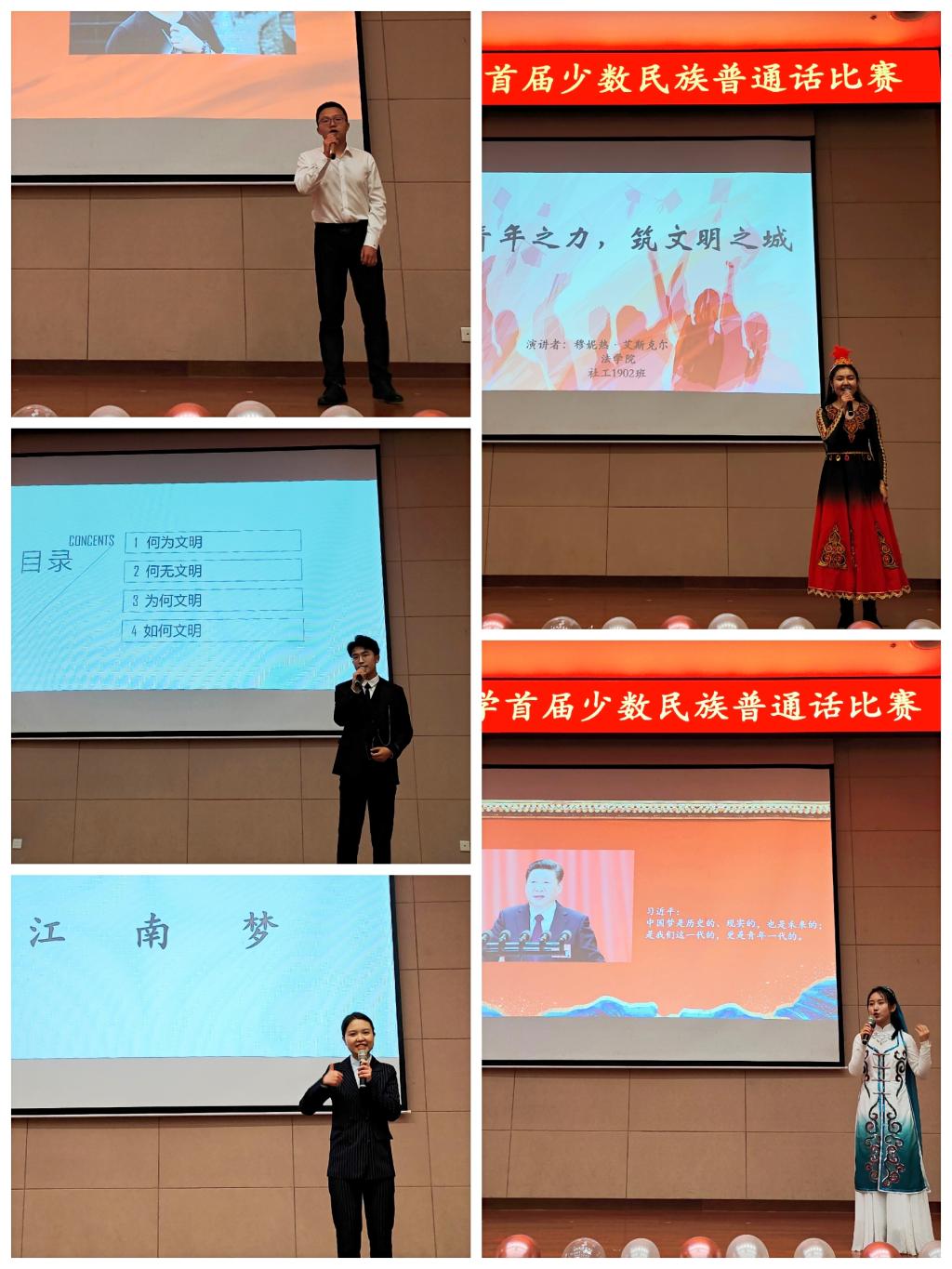 在主持人對比賽評委、比賽流程及比賽規則進(jìn)行了介紹后,本次比賽正式開(kāi)始?,F場(chǎng)座無(wú)虛席,來(lái)自維吾爾族、藏族、蒙古族、回族、哈薩克族、土家族等15名晉級決賽的少數民族同學(xué)身著(zhù)民族服飾,圍繞“筑夢(mèng)新時(shí)代,共創(chuàng )文明城”的主題,結合自身經(jīng)歷和身邊的故事,抒發(fā)了新時(shí)代青年對創(chuàng )建全國文明城市的認識和投身文明創(chuàng )建的熱情和擔當。選手們各顯神通,寓情于聲,風(fēng)格各異,彰顯了當代少數民族大學(xué)生積極向上的精神風(fēng)貌。精彩的演講不斷博得臺下同學(xué)們的掌聲和喝彩聲,現場(chǎng)氣氛十分活躍。評委們分別從主題內容、語(yǔ)言表達、即興演講和綜合印象等方面為選手們進(jìn)行了點(diǎn)評,與此同時(shí)現場(chǎng)大眾評審也為選手們打出了自己心中最滿(mǎn)意的分數。經(jīng)過(guò)激烈的角逐,最終來(lái)自法學(xué)院社工1902班穆妮熱·艾斯克爾同學(xué)榮獲一等獎,她賽后表示:“比賽不僅僅是一次思想的碰撞和交流,也激發(fā)我作為中華民族的自豪感,從比賽主題‘共創(chuàng )文明城’到‘筑夢(mèng)新時(shí)代’只有參與者,沒(méi)有局外人,作為新時(shí)代的各族青年,我們更應該肩負起一種使命和擔當,以眾人拾柴的磅礴之力,腳踏實(shí)地為中國夢(mèng)添磚加瓦?!?/p>