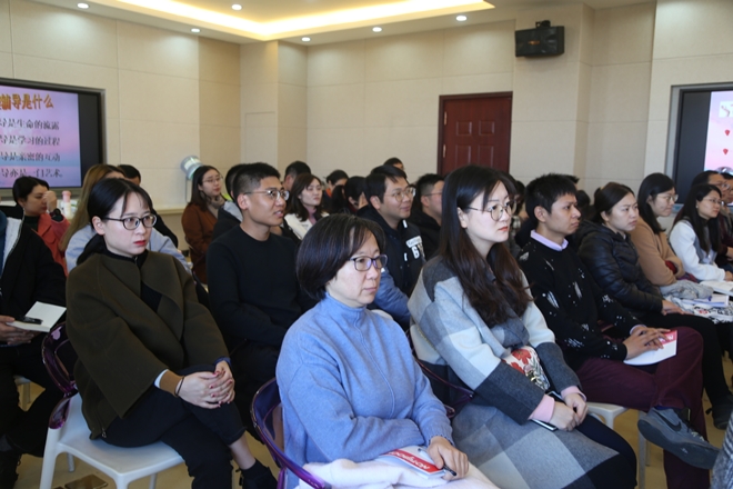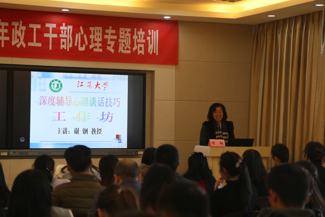 為貫徹落實(shí)江蘇省教育廳(蘇教學(xué)函〔2019〕10號)文件精神,進(jìn)一步擴大oety歐億心理健康教育工作的覆蓋面,發(fā)揮全員協(xié)同育人的功能,12月12—13日,學(xué)生工作處特邀江蘇大學(xué)心理健康教育中心總督導(原主任)謝鋼教授來(lái)校開(kāi)展心理健康教育專(zhuān)題培訓,學(xué)生工作處副處長(cháng)單筱婷、心理健康教育中心專(zhuān)兼職教師、各學(xué)院黨委副書(shū)記、輔導員、學(xué)生班主任、研究生導師、學(xué)工、后勤管理干部,以及來(lái)自無(wú)錫高校心理中心的專(zhuān)職教師等110余人次在人文學(xué)院517智慧教室參加了本次培訓。培訓由學(xué)生工作處副處長(cháng)單筱婷主持。