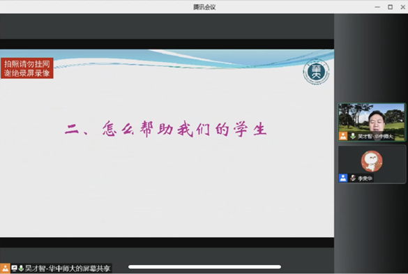 吳才智教授就《疫后大學(xué)生心理問(wèn)題與應對》作專(zhuān)題培訓。他以豐富的案例作為開(kāi)場(chǎng),詳細剖析了心理危機中的應激事件、易感人群和識別征兆。他指出,當前大學(xué)生心理健康形勢發(fā)生系統性變化,促使我們思考工作模式,合理配置資源。他還就疫后心理危機干預機制提出了幾點(diǎn)建議:一是依托現有體系,在疫情排查、日常管理和專(zhuān)業(yè)咨詢(xún)中發(fā)現識別;二是解決現實(shí)問(wèn)題,在生命安全、生活秩序和學(xué)業(yè)就業(yè)方面做好基本保障;三是分級分類(lèi)干預,對普通人群進(jìn)行心理教育,對易感人群進(jìn)行心理幫扶,對高危人群進(jìn)行危機干預。