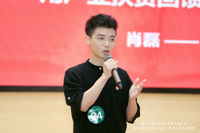 在第十一屆“江蘇省大學(xué)生年度人物”暨2021年“最美大學(xué)生”推選現場(chǎng)風(fēng)采展示環(huán)節,肖磊同學(xué)以“江水之下,熱忱之上”為題,從“三峽川江,點(diǎn)燃夢(mèng)想之光”之維,講述他如何與百萬(wàn)三峽一名一起,舍小家、為大家奔赴異鄉;從“江南星河,照亮創(chuàng )業(yè)征途”之維,講述了他與五個(gè)同樣來(lái)自三峽地區的移民同行創(chuàng )業(yè),探索“授漁造血”的三峽品牌設計扶貧模式,用專(zhuān)業(yè)能力致行內陸發(fā)展的故事;從“家國有夢(mèng),鑄就設計理想”之維,講述他響應國家號召,投身中國航天精航智造、山河智能?chē)H工程機械設計等大國重器項目的設計。最終,肖磊憑借飽含感召力的先進(jìn)事跡、富有感染力的現場(chǎng)展示獲江蘇省高校本科組展評成績(jì)第一名。
