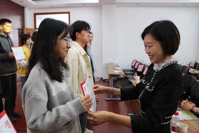 學(xué)生工作部部長(cháng)張菁燕為獲得省級和蘇南地區獎項的老師頒獎