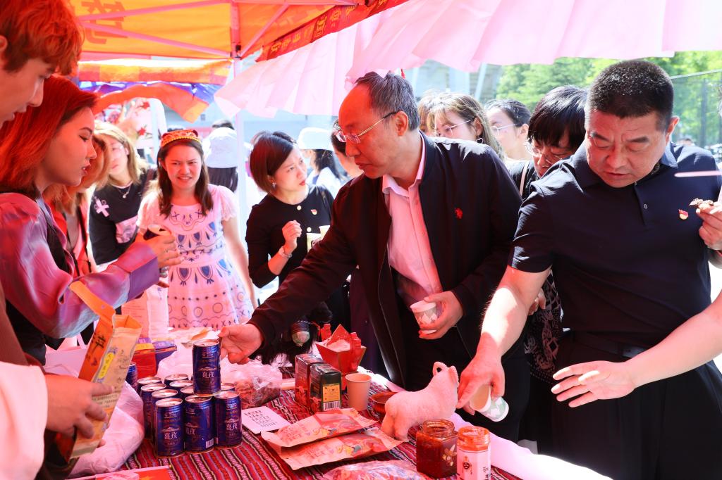 在民族特色風(fēng)情展上,來(lái)自8個(gè)民族展位的特色美食、工藝品琳瑯滿(mǎn)目,讓人目不暇接。維吾爾族鮮嫩可口的肉串、古色古香的樂(lè )器;哈薩克族營(yíng)養鮮美的駝奶、獨具一格的服飾;藏族栩栩如生的掛畫(huà)、齒頰留香的酥油茶;蒙古族的工藝品、馬奶酒;柯?tīng)柨俗巫宓陌讱置?,苗族的特色飾品,回族的蓋碗茶,壯族的精美繡球……讓參觀(guān)師生充分了解了各民族的風(fēng)土人情,感受到少數民族風(fēng)情的魅力。