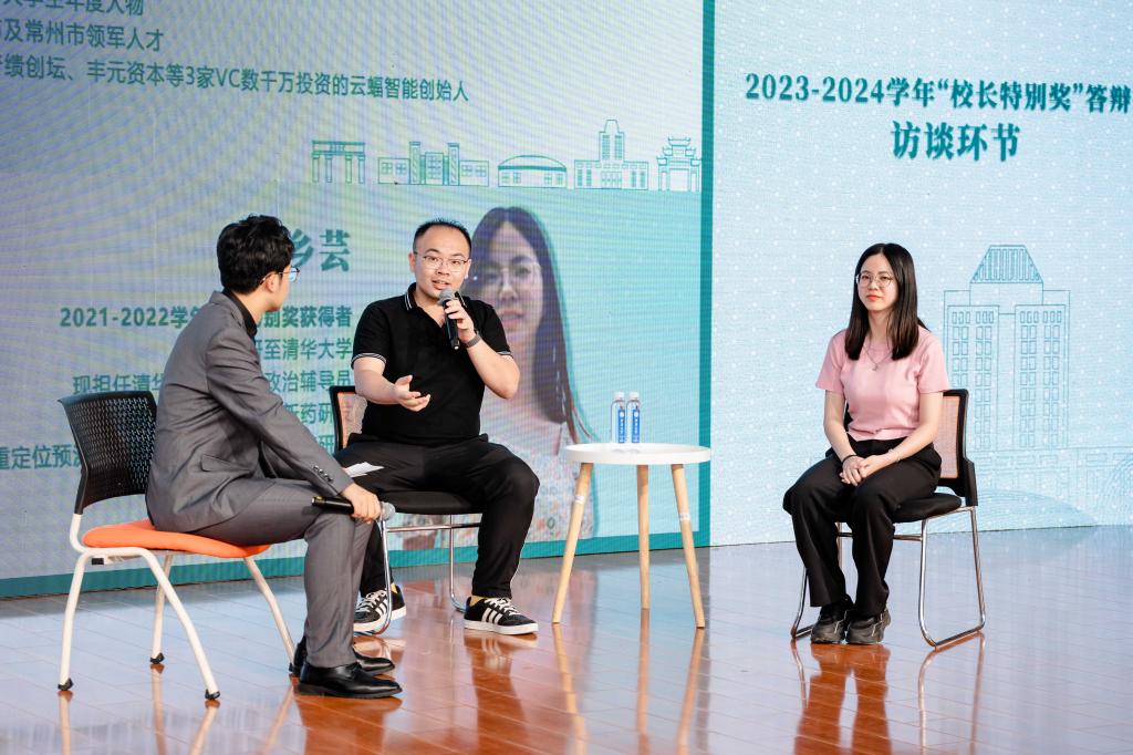 答辯會(huì )還邀請了2012-2013學(xué)年、2016-2017學(xué)年兩屆校長(cháng)特別獎獲得者、云蝠智能創(chuàng )始人魏佳星,2021-2022學(xué)年校長(cháng)特別獎獲得者、清華大學(xué)研究生毛鄉蕓兩位優(yōu)秀校友進(jìn)行訪(fǎng)談。魏佳星分享了他的創(chuàng )業(yè)故事,毛鄉蕓講述了母校的培養對她在清華大學(xué)求學(xué)的深遠影響。兩位校友寄語(yǔ)學(xué)弟學(xué)妹,趁青春要明確方向、勇敢嘗試,并持之以恒,才能創(chuàng )造無(wú)限未來(lái)。