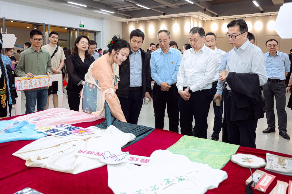 啟動(dòng)儀式上,濱湖區委統戰部、校黨委統戰部、無(wú)錫靈山文化旅游集團、設計學(xué)院領(lǐng)導共同啟動(dòng)“萬(wàn)象歸一·中華魂”龍文化主題創(chuàng )意設計大賽;校團委為山水城黨群部代表頒發(fā)“鑄牢”教育第二課堂校外輔導員聘書(shū);與會(huì )領(lǐng)導為學(xué)生代表贈送《中華民族共同體概論》教材。在熱情歡快的民族樂(lè )器、舞蹈、毽球表演項目中,領(lǐng)導嘉賓與現場(chǎng)師生共同參觀(guān)民族文化風(fēng)情展,了解各民族工藝品、服飾文化,體驗美食、國風(fēng)軟筆以及剪紙技藝,共享民族文化盛宴。