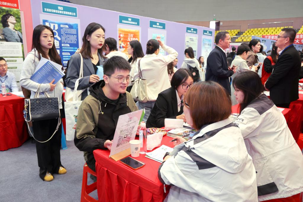 招聘會(huì )現場(chǎng)為學(xué)生提供生涯咨詢(xún)服務(wù)